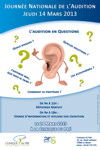 En 2013, La Clinique du Pré a souhaité participer à cet évènement afin d'offrir à tous ses publics une opportunité de rencontrer de nombreux professionnels de santé, médecin ORL, audioprothésiste, sophrologue, orthophoniste, au cours d'une journée complète de dépistage et d'information.